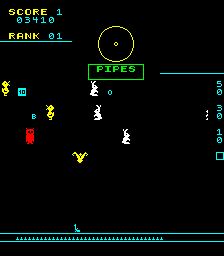 ![]() | Droid War (1983) | Also requiring two players simultaneously to shoot each other. Instead of wagons, etc. travelling up the middle to block shots, you have a yellow wall scrolling up that you have to shoot through. An added feature is that the player is guarding 8 droids behind them and the aim of the player is kill all 8. The players can not shoot each other directly; you win by killing the droids. This was originally a type in game for the Dragon 32 in Personal Computer News magazine (September 15-21, 1983) in the UK. |