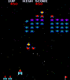 ![]() | Phoenix (1980) | Expanding on the Galaxian concept, Phoenix had 5 different waves of aliens, including some that you would just injure if you didn't shoot them dead center. The 5th wave was tackling the mothership, where you have to shoot the aliens that are protecting it, and then shoot through the hull of the ship, the rotating barrier beyond that, and then the head alien himself. You also have a shield that you can activate, but it takes 7 seconds to recharge it after it wears out. |