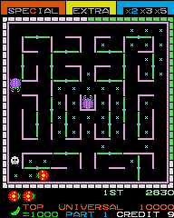 ![]() | Crazy Painter (1983) | Like Arex the basic concept is the same (fill in a certain percentage of the screen while avoiding enemies), but you draw a trail to fill it in (you don't fill in by outline). Differences with both Qix and Arex is that you have to fill in the whole screen, you have a limited amount of paint (you have to get bonus shapes to get more), and you can "waste" paint on areas that you have already covered. Also, the dog can come by and get footprints in your paint, so you have to refill those areas. |