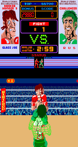 ![]() | Punchout (1984) | A unique boxing game, which had two separate screens in the arcade cabinet (the top one showed stats, your opponent, etc., and the bottom showed you (semi-transparent) in the ring. You gradually worked your way through tougher and tougher opponents in order to get to the #1 ranked boxer in world, punching and dodging on your way. |